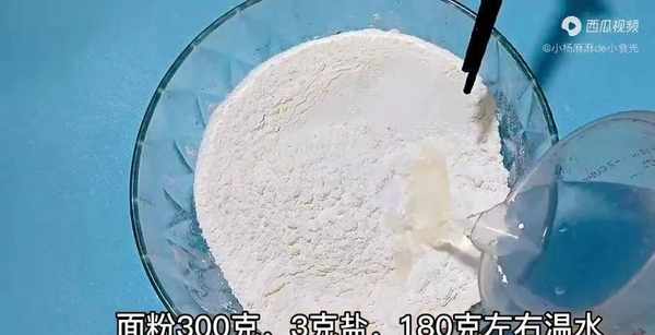 先准备普通面粉500克,3克盐,180克左右温水,水量要少量多次慢慢加。可以根据情况再调整,因为每个人量水的标准不一样,多少都会偏差。所以慢慢加,慢慢搅拌。