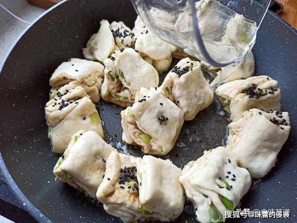 12、煎至底部金黄色,倒入清水,没过花卷的三分之一,盖锅盖,约8分钟左右,听到滋滋啦啦的声音即可出锅。