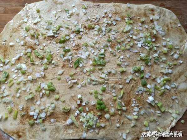 7、先刷一层食用油,一定要涂抹均匀,再撒入盐、十三香,最后铺上葱花。