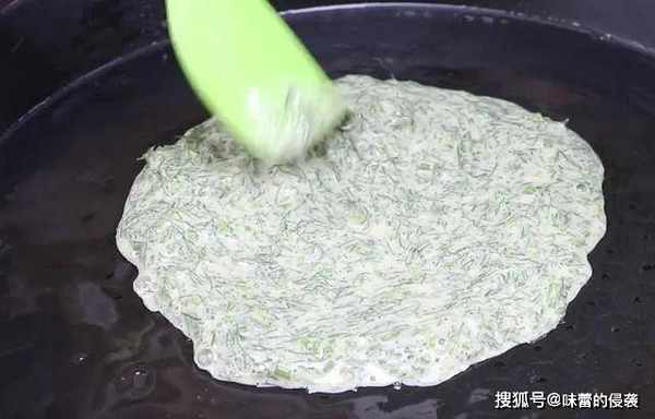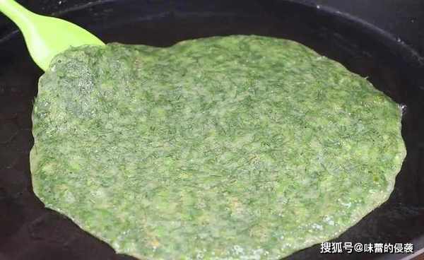 7、茴香菜和面糊很容易煎熟,半分钟就翻面一次,煎1分钟就可以吃了。