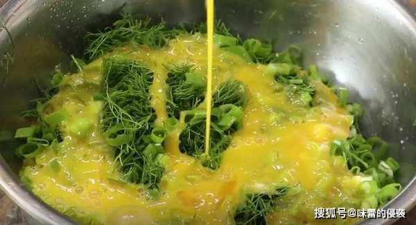 3、将蛋液倒在切碎的茴香菜中,搅拌均匀。