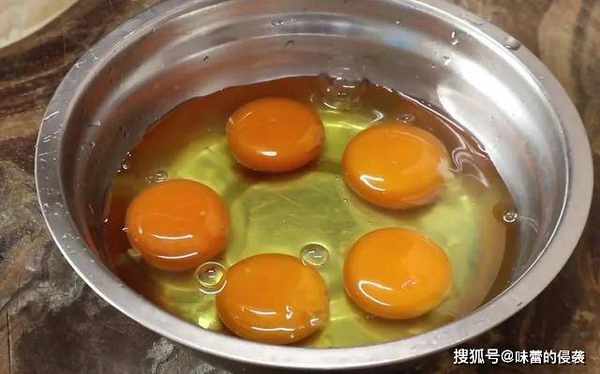 2、接着准备5个鸡蛋,倒在碗中,放一勺食盐调味。