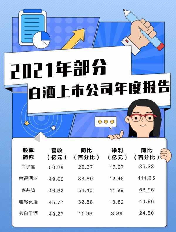 数据显示,2021年,舍得、水井坊、迎驾贡、老白干的营业收入分别为49.7亿、46.3亿、45.8亿和40.27亿,再加上生猛的酒鬼酒34.14亿和刚跨过50亿的口子窖,上市企业接近或刚到50亿是一件值得庆贺的事,虽然酒鬼酒距离50亿还有些距离,但其生猛的增长率,50亿可能对其来说更是小菜一碟。