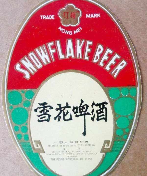 在建设大路的东段,即从铁西广场到兴工街有很多效益非常好的企业。其中位于兴华街建设大路交汇处的酿酒厂和兴工街建设大路的啤酒厂就是其中的两个。这两个厂都生产啤酒,不同的是酿酒厂还制造果酒。当时有一款风靡一时的“山楂汽酒”据说就是酿酒厂的杰作。所以在沈阳老百姓眼里,酿酒厂做的啤酒有点不“专业”,沈阳啤酒厂的产品更受青睐。当时沈阳啤酒厂有一款叫“红梅雪花”啤酒,时至今日,仍然是很多老酒民心目中的王者,甚至秒杀现在的一众进口货,来看一下它的商标标识图片: