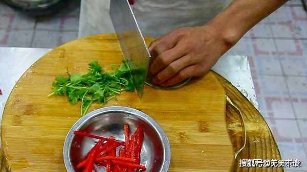红椒半个,去籽后切成丝,香菜一小把,随便切上几刀,把香菜切成段,凉拌菜中放一点红椒丝配色好看。