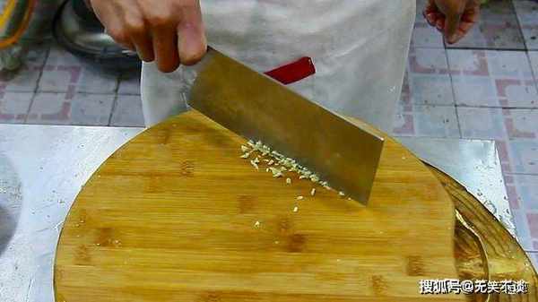 大蒜四粒,拍扁后切成碎末,把蒜末放入盘中备用。