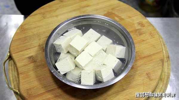1.首先我们准备一下食材:老豆腐一块,先一分为二,再切成四四方方的豆腐块,放在盆中用清水浸泡。
