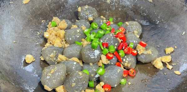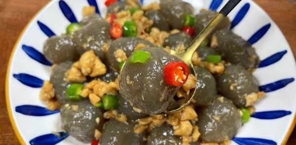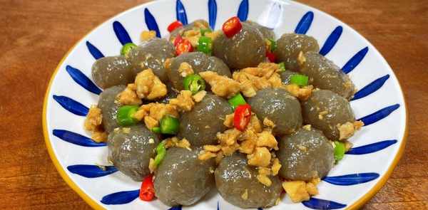 5、小丸子晶莹剔透,柔软有弹性,光滑。春天吃一碗,暖身暖胃。没想到平时用来勾芡的红薯淀粉竟然能做出这么好吃的菜。抓紧时间试试吧。