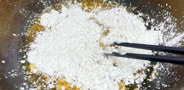2.锅里加水,开小火,水温的时候分次加入少量的红薯淀粉,边倒边搅拌,切记不要一下子倒太多,粘度很难控制,搅拌到红薯的淀粉有明显的阻力时,搅拌不动即可关火。