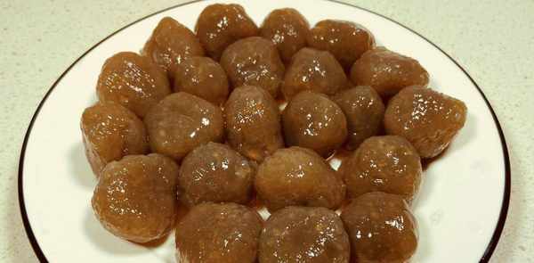 3、取一个干净的小碗,在碗内均匀抹上一层食用油,放入煮好的红薯淀粉。这时候淀粉团很火。我们让它静置一会儿,让温度下降,然后我们添加一次。手套上抹少许食用油,以免粘手,取一小块淀粉球,放在掌心,揉成鹌鹑蛋大小的红薯淀粉球,放入在盘子上。当所有的丸子都做好后,在锅里烧开水。水开后,将丸子放入锅中,煮至晶莹剔透,捞出放入冷水中冷却。红薯淀粉球冷却后非常有弹性。看他们。真可爱。