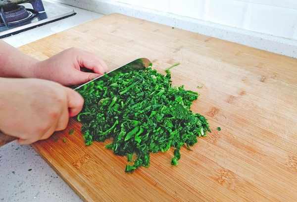 4、将处理好的荠菜放在案板上,换刀切小一点。