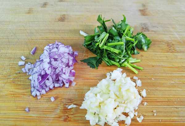 1、大蒜3瓣,去皮切碎,不要剁得太细。