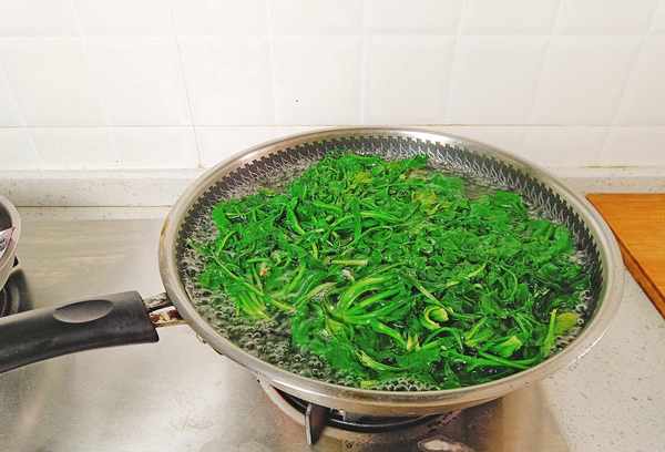 3、水焯30秒后,捞出过凉水。冷却后立即取出,将牧包内的水分挤出。虽然牧包本身并没有难闻的涩味,但焯水可以快速去除其中的草酸。众所周知,草酸不利于钙的吸收。