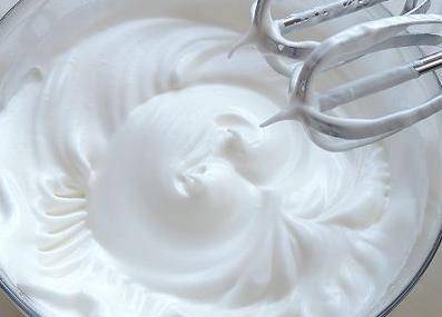2、蛋白加入白醋或柠檬汁去除腥味,加入白砂糖,用打蛋器中速打4分钟左右,直到出现尖锐的边缘。不要过度。将筷子插入蛋清中,筷子可以立起来。