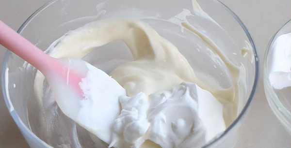 3.将蛋白和蛋黄糊一起搅拌,轻轻混合。泡沫消了,蒸出来的饼就不软了。