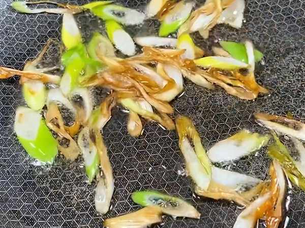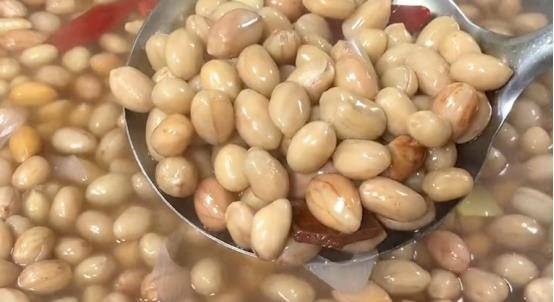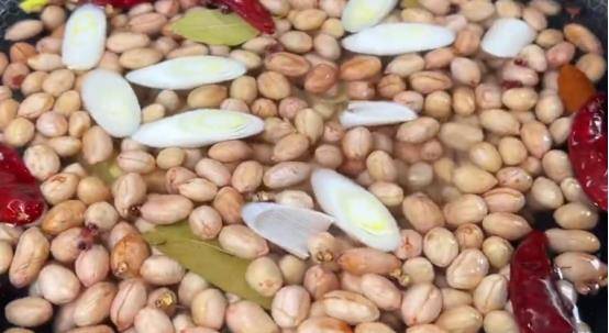 花生米炖好后,用筷子把锅里的调料全部剁碎,然后用漏勺把花生米挖出来,放在一个大碗里。锅内油热后,放入葱段炒香。