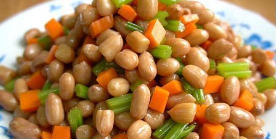 接下来,准备一半的胡萝卜,先切成厚片,再切成粗条,最后切成小方块。将两根芹菜切成小方块。将葱切成片。花生米煮熟后,关火,盖上锅盖再煮15分钟。