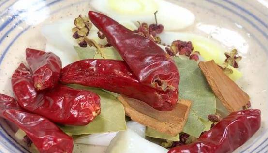 接下来,准备一小块切成薄片的生姜和一些切成薄片的葱。把它切成薄片放在盘子里,然后准备几片月桂叶、两根肉桂、一把花椒和几根干辣椒。