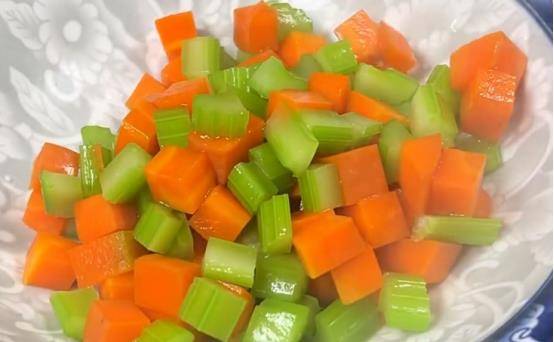 接着另取一锅,水烧开后,加入少许食用油,将胡萝卜放入锅中焯一分钟,再放入芹菜焯30秒,捞出盛入碗中。