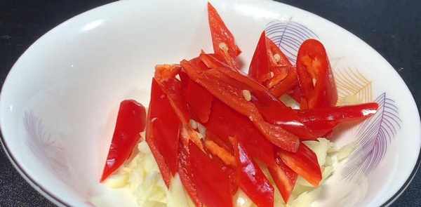 2.准备一把大蒜拍碎,切成蒜末,两个红线椒,从中间片开,切成菱形片,切好之后和蒜末装一起备用,