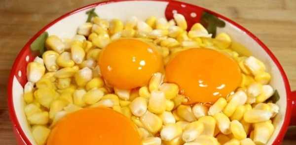 准备两个新鲜的水果玉米,用手把玉米粒剥下来,倒在大碗里,加入清水把玉米洗干净,控水捞出放小碗里,里面打入3个母鸡蛋,