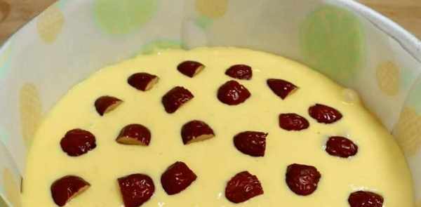4.发酵好后用筷子搅拌一下,排空里面的气体,准备一个蛋糕模具,在底部和侧面铺上一层油纸,防止粘连,倒入搅拌好的玉米面糊,震动两下,排除里面的空气,摆上喜欢吃的果干,