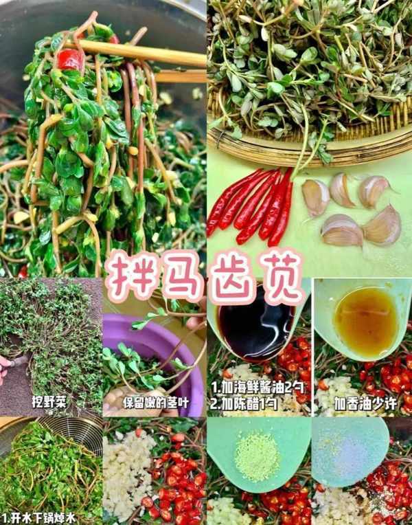 ②焯好的马齿苋加入蒜末和小米椒,加2勺海鲜酱油,1勺陈醋,加少许香油、鸡精和少许糖拌匀