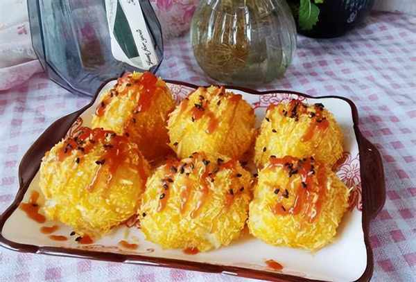 鸡蛋打散,先刷一层面粉,再刷一层蛋液,再裹一层面包屑,烤箱180度烤18分钟,蘸上番茄酱和沙拉酱吃。