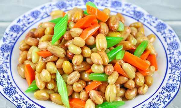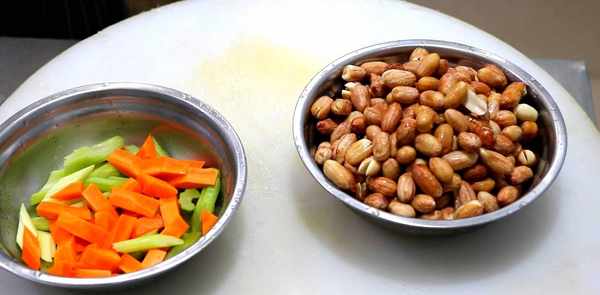1、准备一把花生米,放入小碗中,加水浸泡10分钟;芹菜两根洗净,切成菱形块;将半根胡萝卜切成菱形块,放入盆中备用。