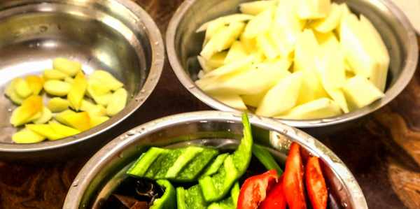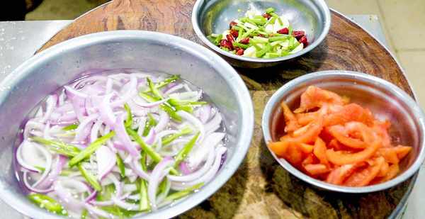 2、准备洋葱1个先从中间切开,再切成洋葱末,用水泡一会儿;4个灯笼椒切成斜片,大蒜切成蒜片,放入锅中,再放入几颗干红辣椒。两根小葱切块,2分钟后西红柿去皮,上火切块放在小盆里待用。
