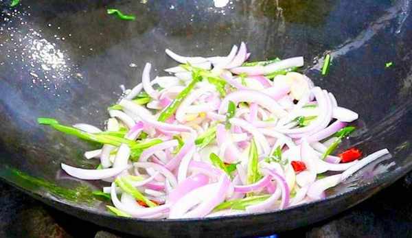 3、炒锅烧热,加入少许食用油,放入洋葱、大蒜和红辣椒炒香,再加入洋葱和胡椒粉,翻炒几下,加少许醋,翻炒,加入陈醋即可让洋葱更脆。