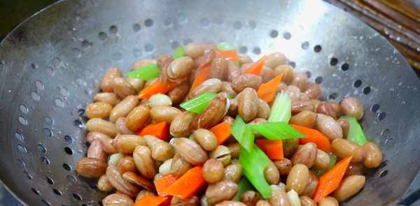 2、锅中烧开水,加入少许植物油,待水开后,交替放入坚果、芹菜和胡萝卜,连续压几下,大火煮两分钟,捞出监测水。