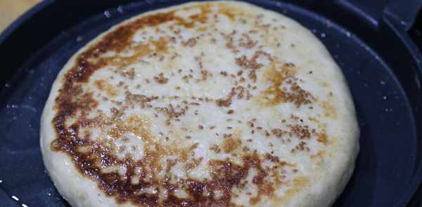 5.电热锅烧热,刷一层植物油,然后把面条铺在锅上,撒少许白芝麻,盖上锅盖,半分钟后翻面,煎至另一面微黄,即可再次转动。煎另一面,淋上少许植物油。