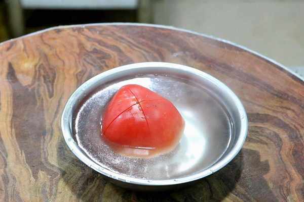 1、准备1个西红柿,洗净并在上面划上十字刀,放入小盆中,加入适量的开水浸泡2分钟,这样有利于西红柿去皮。