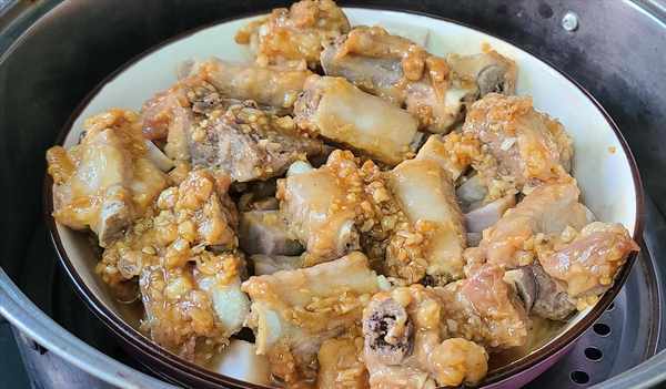 腌制过程中可以准备排骨。芋头芋头去皮切成小块,放在碗底。撒上少许盐,让芋头更入味。等待一切准备就绪后,将腌制好的排骨放在芋头上,用文火炖约20分钟。