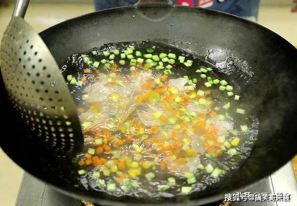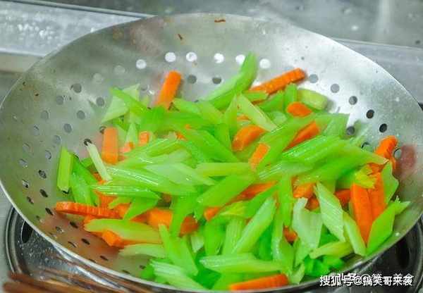 锅内烧水,加入少许的食盐入底味,水烧开以后芹菜和胡萝卜,焯水30秒钟倒出,用清水冲洗冷却,控干水分备用,清水冲洗能防止食材变色,口感更脆。