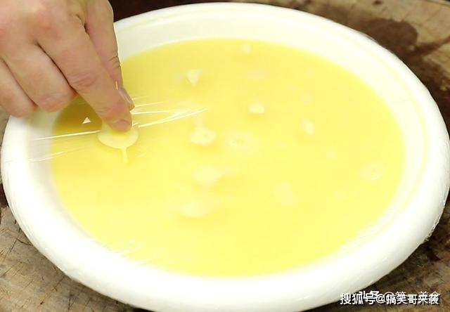 加入适量的温开水,水量是蛋液的1.5倍,充分搅匀以后用密漏篦出没有打碎的蛋液,再用保鲜膜封住,防止蒸的时候水汽滴进去,造成表面不平整,扎点小孔方便蒸汽流通,受热更均匀,开锅以后上笼,中火蒸5分钟。