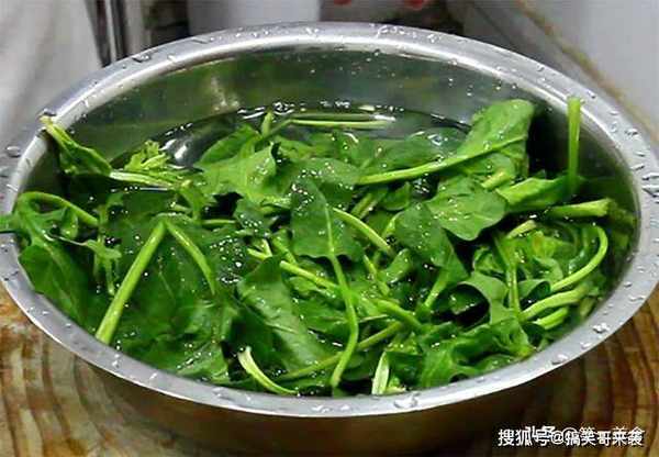 准备菠菜一把,把根部切掉,用清水淘洗干净备用。