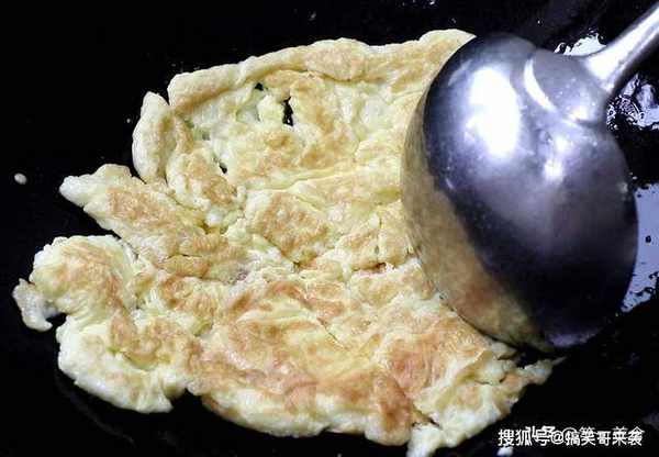 锅内烧油,油温升至6成热,油面冒青烟时倒入蛋液,开小火,用勺子轻轻推动让蛋液均匀受热,蛋液一面定型后翻面,蛋液全部定型呈金黄色时,用勺子打散,倒出备用。