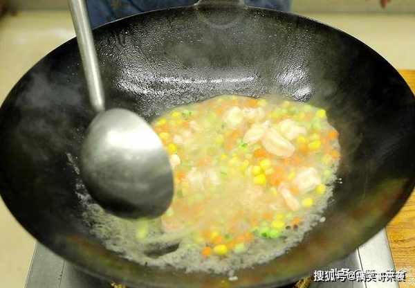 锅内烧水,水烧开以后放入黄瓜丁、胡萝卜丁、玉米粒,大概煮1分钟左右,把虾仁倒进去,煮至虾仁打卷、变色即可倒出。