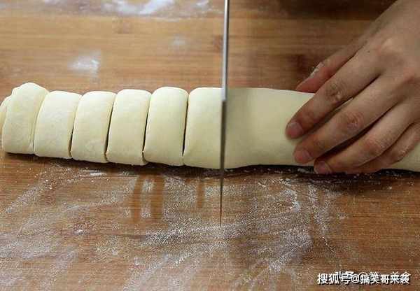 在案板上撒一层面粉,把面团拿出来揉一揉排气,面团揉光滑以后用手压扁,擀成长方形的面饼,在面饼上均匀刷上植物油,撒上面粉方便分层,再撒上一点食盐入底味,把面饼卷起来,卷成长条,用刀切成3厘米厚的饼坯。