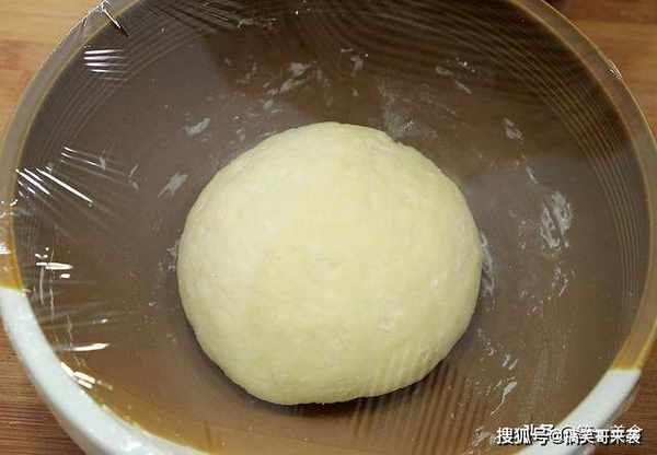 把面絮揉在一起,揉成一个光滑的面团,用保鲜膜盖住密封发酵至原来的2倍大,大概两个小时就可以了。