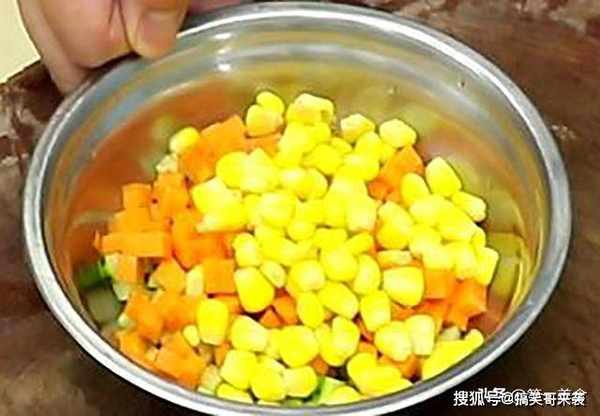 切点黄瓜丁、胡萝卜丁、玉米粒备用。