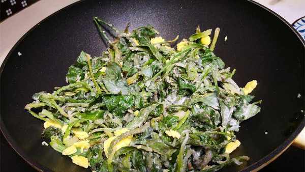 3、上锅蒸约3~5分钟后,将车前草捞出,摇匀后装盘,然后起锅加入适量的油,倒入2个打散的蛋液煎熟。鸡蛋均匀后倒入蒜末炒香,再加入打散的香蕉继续炒鸡蛋,炒匀,加足量盐,再次搅拌即可出锅,好吃又好吃!