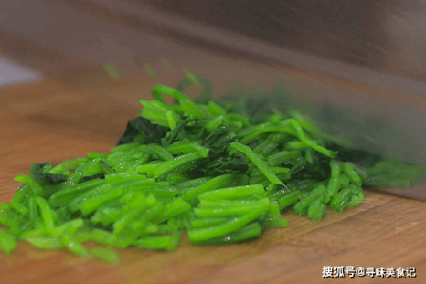 准备菠菜一把,洗净放入沸水中,焯水30秒钟。变软以后捞出,用凉水冲洗一下。然后把菠菜中的水分攥干,切成小段备用。