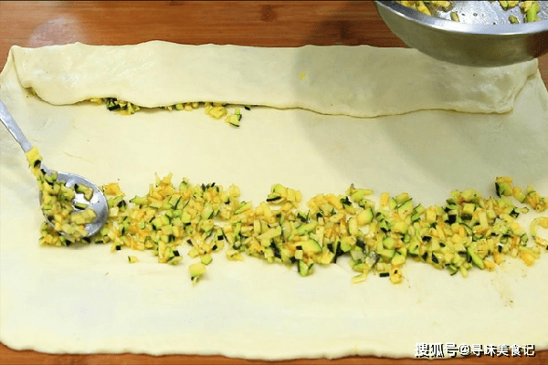 然后把发酵好的面团取出来,揉一揉排一下空气,面团揉圆以后用擀面杖擀成一个薄片,把边缘修整齐一些,放上调好的馅,留一个边折叠起来盖住馅料,接着再放馅料再折。