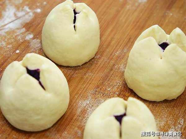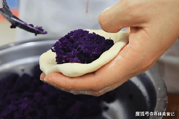 全部擀完以后包上紫薯泥,像包包子一样把紫薯泥包起来,包好以后用手团一团,团成一个小圆包。