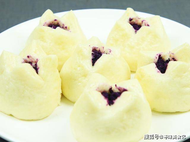 中火蒸15分钟左右 馒头就熟了,这个时候不要急着掀开锅盖,停火5分钟左右,就可以掀开锅盖把紫薯馒头取出放在盘中。