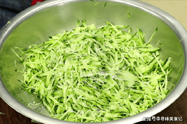 不用削皮、直接切成细丝,加入一勺食盐腌制十几分钟,主要是为了去除里面的水分,防止包饺子的时候出水、破皮。