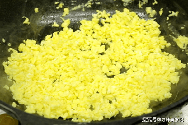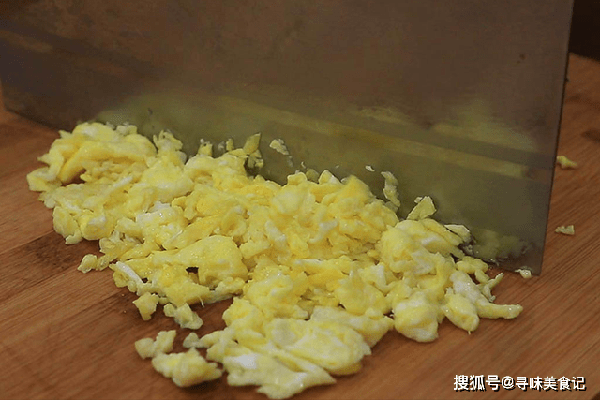 碗里打入4个鸡蛋,搅拌打散成蛋液,把蛋液凉油下锅,快速炒散、炒碎、炒定型,立马倒出来,这样鸡蛋又嫩又碎,就不用再切了。